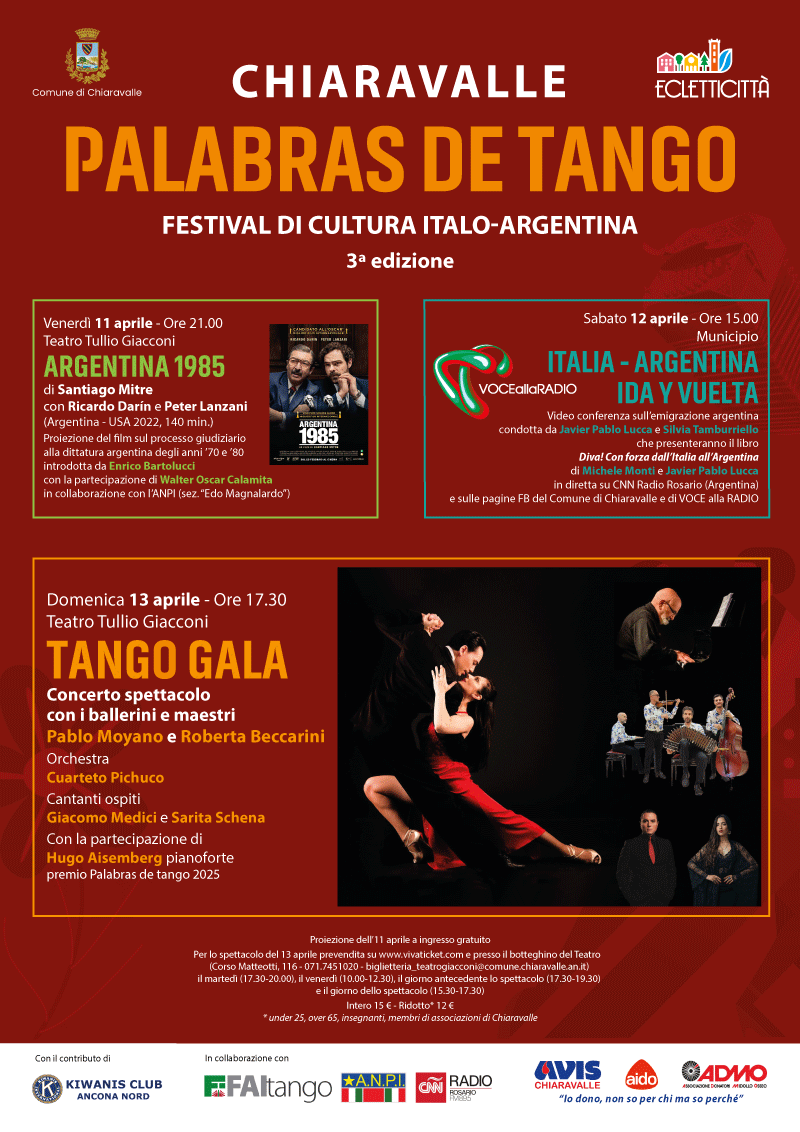 Il festival “Palabras de tango”, giunto alla sua terza edizione, si svolgerà a Chiaravalle dall’11 al 13 aprile 2025, trasformando la città in un crocevia di cultura e arte argentina. Promosso dal Comune di Chiaravalle, il festival celebra il dialogo interculturale tra Italia e Argentina con eventi che spaziano dalla musica alla danza, fino al cinema.