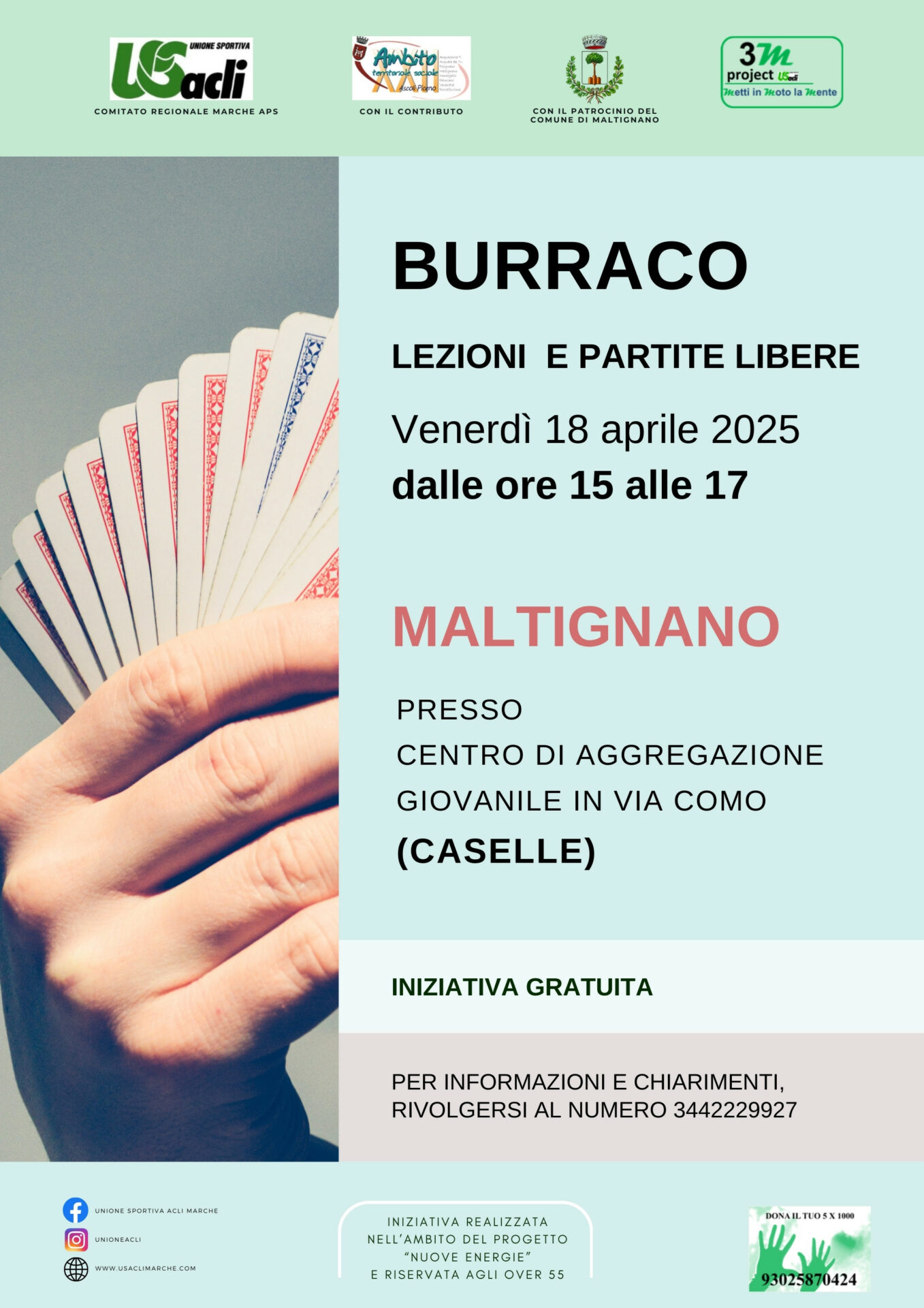 Il quarto appuntamento con il burraco si terrà venerdì 18 aprile, dalle ore 15:00 alle 17:00, presso il Centro di Aggregazione Giovanile in via Como, a Caselle, Maltignano, vicino agli impianti sportivi. Questo evento rientra nel progetto “Nuove energie”, coordinato dall’Unione Sportiva Acli Marche Aps, e si propone di avvicinare i partecipanti ai giochi della memoria attraverso attività ludiche e sociali.
