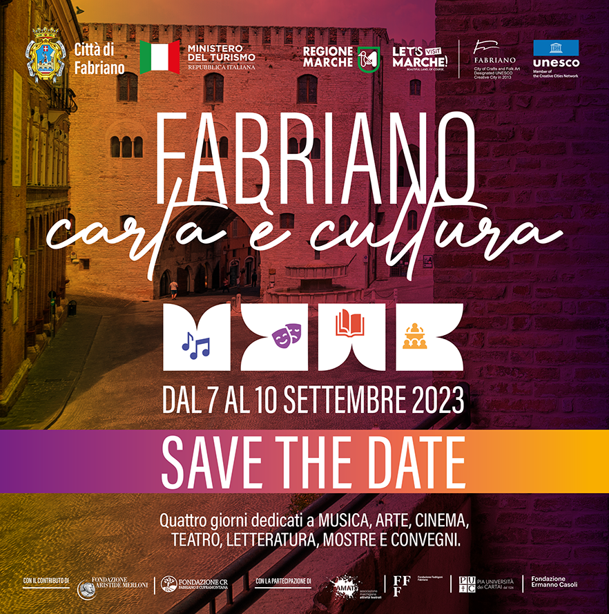 L’evento si svolgerà principalmente nel centro storico di Fabriano, ricco di monumenti storici e luoghi d’arte come il Palazzo del Podestà medievale, l’Oratorio della Carità del XVII secolo, la Pinacoteca Civica e i Giardini del Poio nel complesso gotico dello Spedale del Buon Gesù, il Museo della Carta e della Filigrana e l’ex Cartiere Miliani.Fabriano Carta è Cultura è un’iniziativa organizzata da Città Creativa Unesco con il supporto del Ministero del Turismo e della Regione Marche. Il progetto ha ottenuto il contributo della Fondazione Aristide Merloni, della Fondazione Carifac e la partecipazione di diverse istituzioni e fondazion