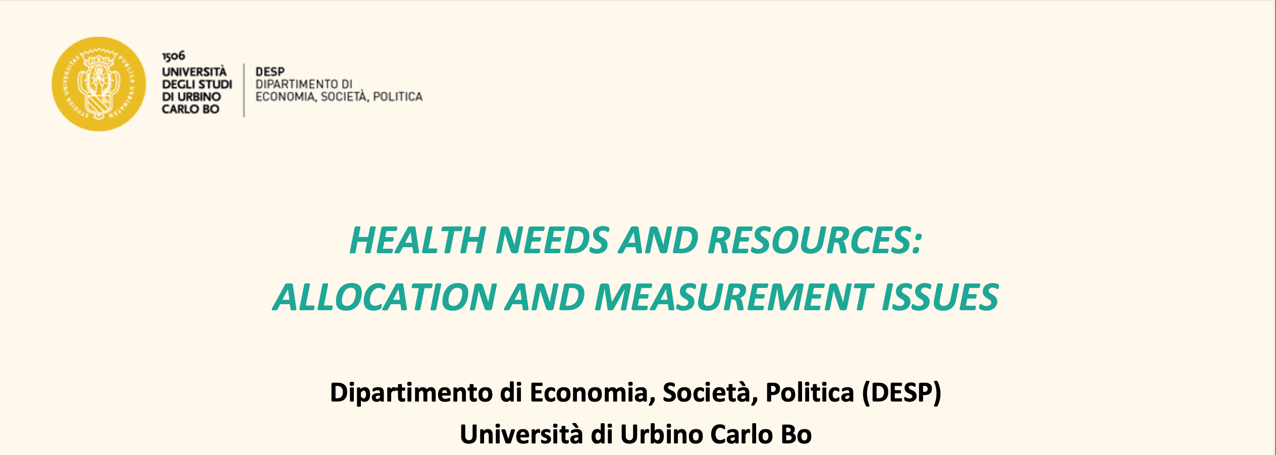 Il convegno “Health needs and resources: allocation and measurement issues” ( ovvero “Bisogni e risorse sanitarie: problemi di allocazione e misurazione” ) si terrà presso l’Aula Rossa di Palazzo Battiferri, in Via Saffi, 42 Urbino, nei giorni 9 e 10 novembre. L’evento è organizzato dal Dipartimento di Economia, Società, Politica dell’Università di Urbino Carlo Bo.