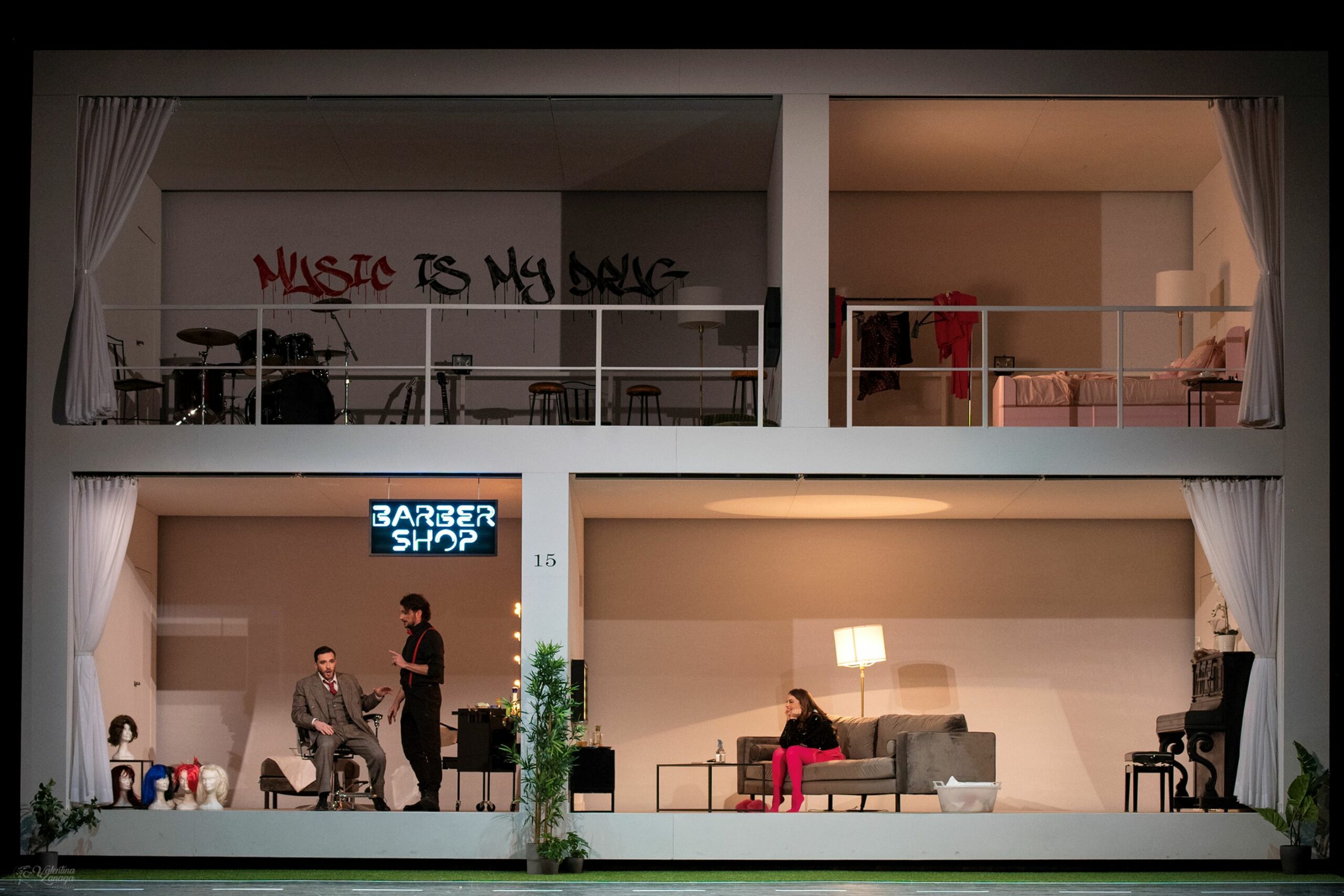 La trama dell’opera ruota attorno a un conflitto generazionale tra giovani e adulti, rappresentato nello scontro tra il mondo antico e il mondo moderno. La storia è ambientata in una moderna unità abitativa a vetri, dove vita privata e pubblica si sovrappongono. Il protagonista, Figaro, aiuta il giovane conte d’Almaviva a conquistare l’amore di Rosina, sfidando le macchinazioni del suo tutore, il dottor Bartolo.