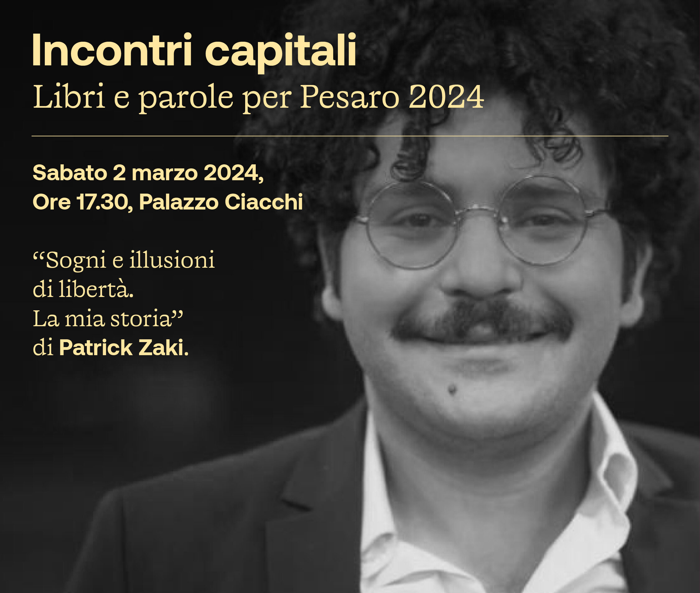 Il 2 marzo alle 17:30, presso Palazzo Ciacchi di Pesaro, Patrick Zaki presenterà il suo primo libro “Sogni e illusioni di libertà. La mia storia” in una conversazione con il giornalista Massimo Veneziani.