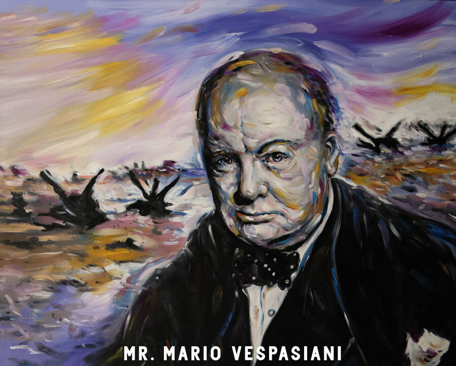 L’artista ha realizzato opere inedite che ritraggono Sir Winston Churchill, figura di spicco del novecento che ha occupato ruoli chiave durante entrambe le guerre mondiali. La personalità straordinaria e poliedrica di Churchill, premiato con il Nobel per la Letteratura, è stata interpretata da Vespasiani in modo visionario, mettendo in luce gli aspetti più intimi e profondi del leader britannico.