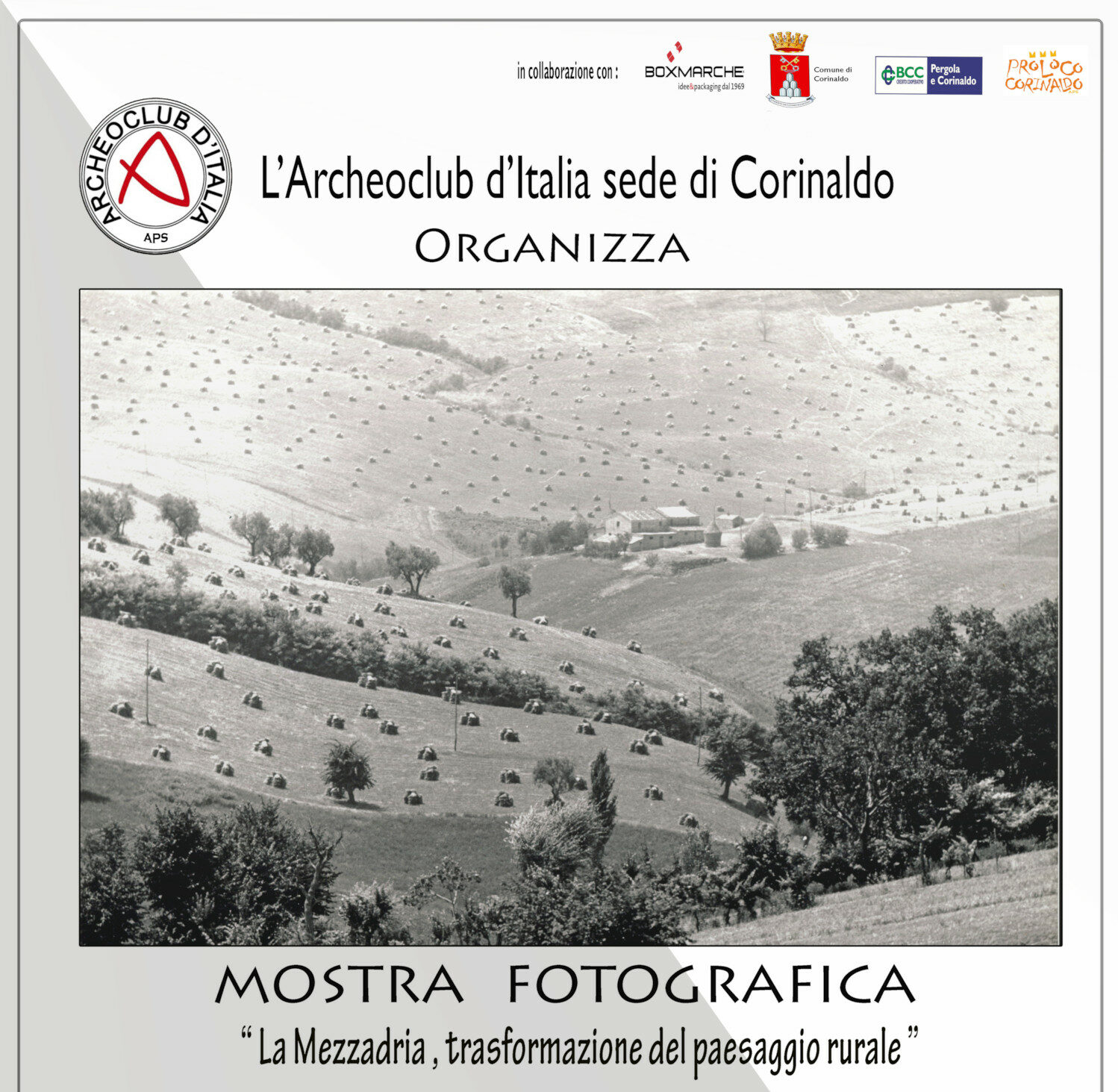 La mostra fotografica intitolata “La mezzadria, trasformazione del paesaggio rurale”, ospitata presso il teatro comunale “Carlo Goldoni” di Corinaldo, mostra trentotto immagini storiche che raccontano la vita rurale del passato. Organizzata dall’Archeoclub locale, la mostra sarà aperta al pubblico dal 23 marzo al 5 maggio, (sabato, domenica e festivi dalle 10 alle 12 e dalle 16 alle 18). Il catalogo della mostra è stato editato dalla Box Marche, con contributi di esperti che analizzano l’importanza dell’economia rurale e la trasformazione del paesaggio nel tempo.