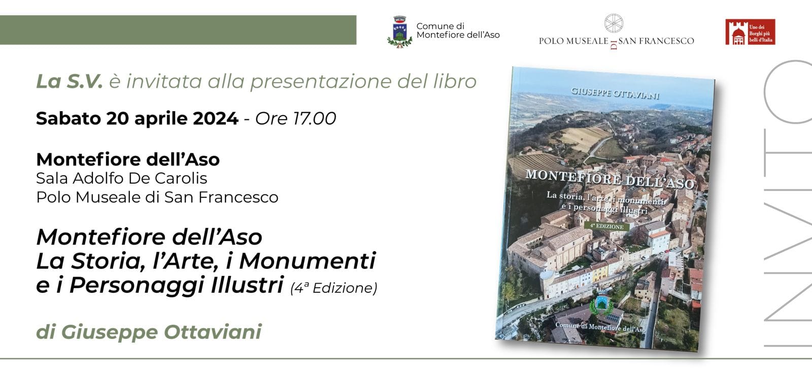 Sabato 20 aprile a Montefiore dell’Aso si terrà un evento di divulgazione libraria della 4° edizione del libro di Giuseppe Ottaviani, “Montefiore dell’Aso – La Storia, l’Arte, i Monumenti ed i personaggi illustri”.