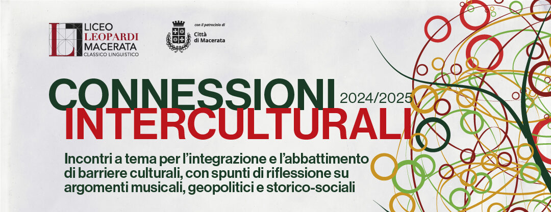 Riparte giovedì 13 febbraio la quinta edizione di “Connessioni Interculturali“, una serie di conferenze organizzate dalla Commissione Intercultura del Liceo Classico e Linguistico “G. Leopardi” di Macerata. Tutti gli eventi si svolgeranno dalle ore 15:00 alle ore 17:00 presso la sede centrale del Liceo, situata in Galleria Luzio, 6. La manifestazione si propone di affrontare l’integrazione culturale in un contesto scolastico sempre più multietnico, con una popolazione studentesca che presenta tra il 15% e il 30% di alunni provenienti da altri Paesi.