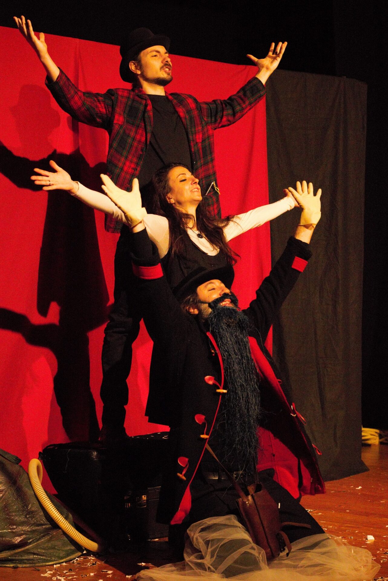 Il ritmo dello spettacolo è veloce, studiato apposta per catturare i sensi del pubblico e trascinarlo completamente nel flusso della storia. L’allestimento, pur nella sua apparente semplicità, nasconde una profonda ricerca che si manifesta nel grottesco, nell’onirico e nel ridicolo, rivelando così il vero senso del linguaggio teatrale. La narrazione è serrata, accompagnata da suoni, rumori e versi che amplificano l’esperienza uditiva e immersiva. E, naturalmente, la domanda che accompagnerà il pubblico per tutta la durata dello spettacolo sarà: “Riuscirà la giovane e avventata moglie a sfuggire alla lama dello spaventoso marito?”.