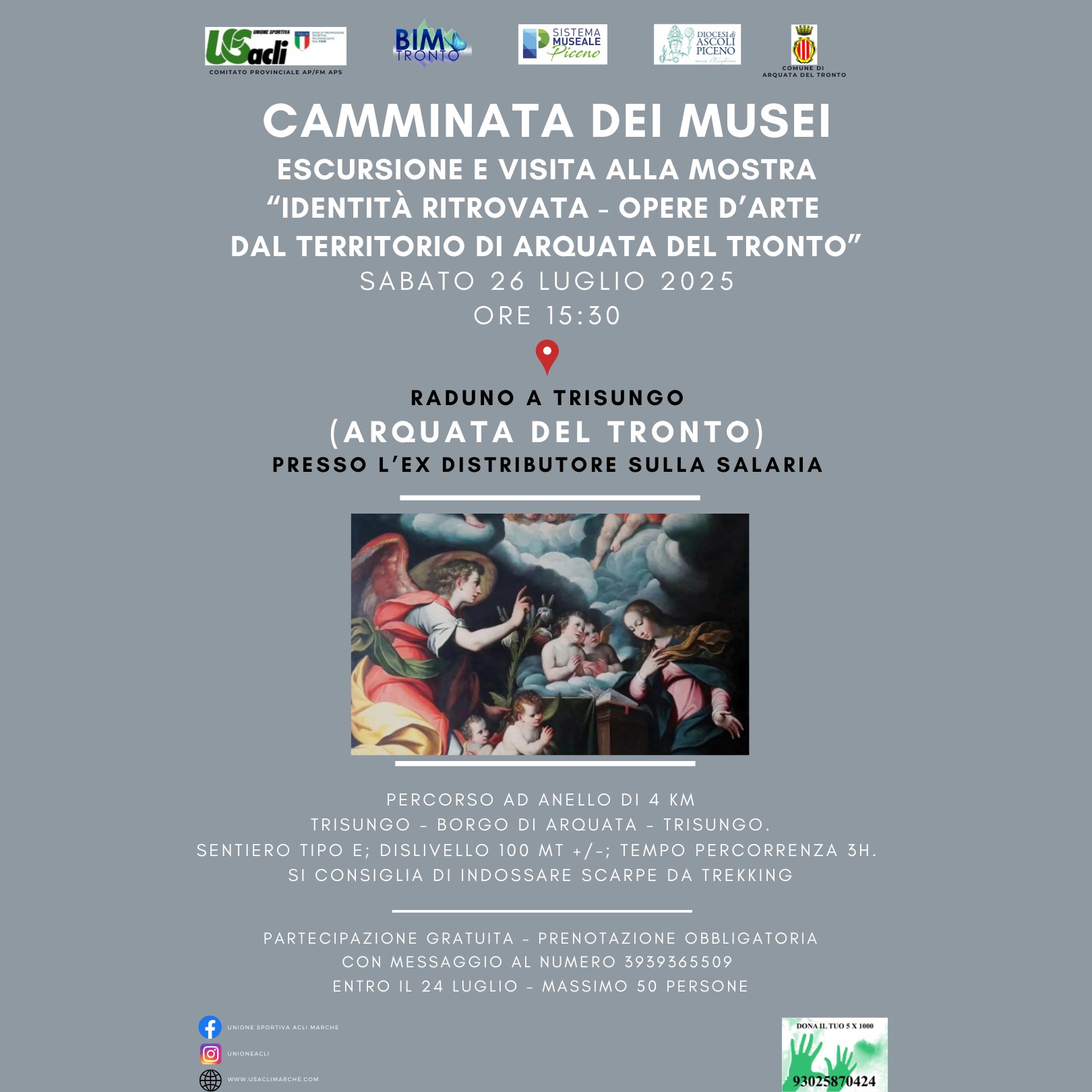 Sabato 26 luglio 2025, partecipa alla “Camminata dei Musei” ad Arquata del Tronto, un’iniziativa che unisce escursionismo e cultura. L’evento, promosso da Bim Tronto e U.S. Acli Provinciale, con la collaborazione di Diocesi di Ascoli Piceno e Comune di Arquata del Tronto, offre un’occasione unica per visitare la mostra “Identità ritrovata” con opere d’arte del territorio.