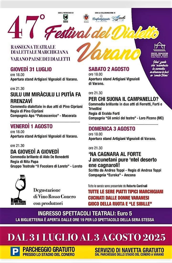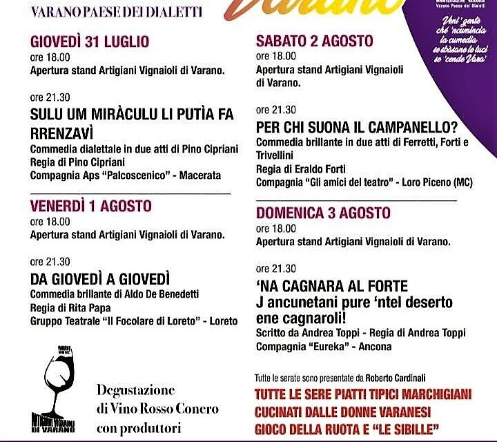 Il Festival si svolge dal 31 luglio al 3 agosto 2025 a Varano, Ancona, il “paese dei dialetti”. Ogni sera, a partire dalle ore 18:00, aprono gli stand degli Artigiani Vignaioli di Varano, offrendo un’occasione per scoprire l’eccellenza e l’autenticità del Rosso Conero e sostenere i produttori locali. Dalle ore 21:30, il palco si accende con le commedie dialettali. La biglietteria apre alle 19:00 e il costo d’ingresso per gli spettacoli teatrali è di 5 euro.
